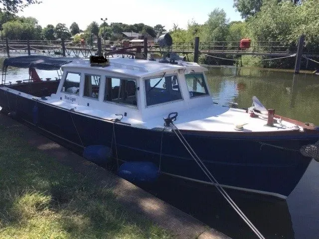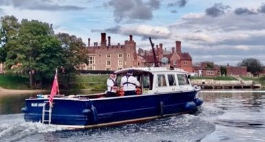 Blue Light, a historic ex Police Launch built in 1951 with Perkins 130HP diesel engine. She is 10 metres (30’) long with an enclosed cabin. Blue Light’s permanent mooring is at Teddington, just downstream from Teddington Lock on the tidal Thames.